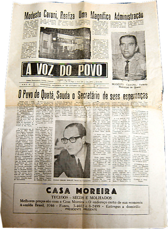 firmar o compromisso. É de Modesto Caroni também a inauguração de Hotel Municipal, com acomodações espetaculares conforme menciona o jornal. A saber , o Hotel Municipal não existe mais, hoje em 2008, transformado em sede da Ação Social da cidade. Quatá continua necessitando de um hotel mais moderno . Na agricultura Modesto criou os viveiros de mudas que eram doadas gratuitamente para os pequenos agricultores incentivando o plantio de café, algodão, etc.. Concluiu a pavimentação asfáltica iniciada por Sífrido Averoldi, sr. Bidi, e era incentivador do futebol amador. Também construiu os alojamentos no Educandário São Paulo da Cruz para as crianças desamparadas ( hoje o educandário não existe mais é um colégio particular). Contratou um dos primeiros dentista para atendimento aos moradores da zona rural e formou a Corporação Musical 9 de Julho além de serviços de assistência aos desamparados dentro tantas outras benfeitorias para área social.