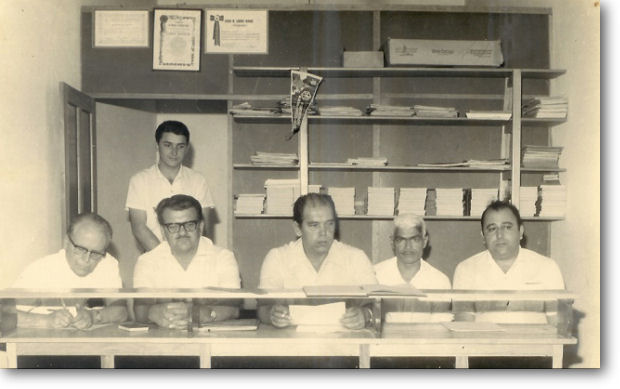 Sr. José Pergentino de Moraes (Presidente do STRQ); do Sr. José Haddad (Gerente do Banco do Estado de São Paulo S/A, atual Banespa) e, no fundo, Luiz Carlos Guimarães.