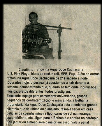 Isto aconteceu entre Claudemiro Alves Cardoso , o Claudinho, e a Música. Claudinho nasceu em 1971 na fazenda Belo Horizonte em Quatá-SP e acredita que este dom teria vindo vindo de seu pai João Alves Cardoso que tocava músicas raizes nas rádios. Claudinho somente viu seu pai uma única vez quando tinha 10 anos. Muito antes seu pai já tinha se separado de sua mãe. Não passou muito tempo seu pai faleceu. Muito amado, sempre foi criado por seus parentes. Passou grande parte de sua infância na companhia de sua avó e seu tio, quando pela primeira vez ao 6 anos viu um violão pendurado na parede, peça de estimação "intocável" de seu tio. Bem que tentou tirar o violão de lá com uma vassoura, da mesma forma que se apanha uma manga do pé. O vento o ajudou na tarefa mas não calculou direito altura. O chão recolheu os pedaços. O vento ventou e Claudinho ficou com a culpa. |