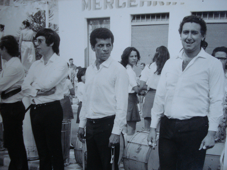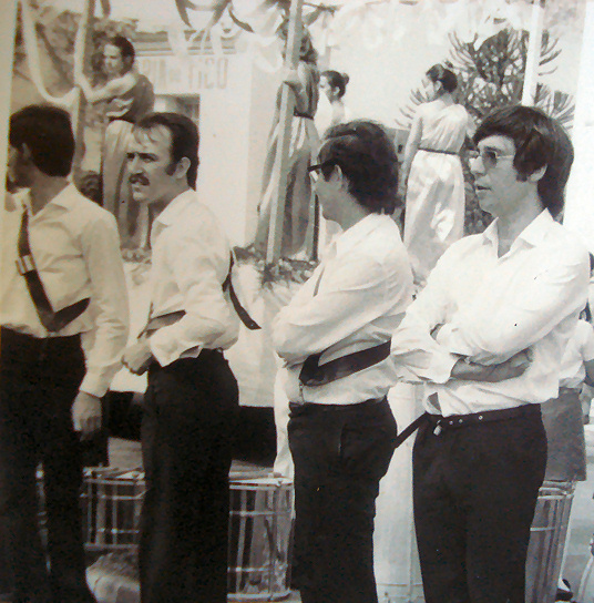 Foto de provavelmente 1974. Em meio ao caracol, evolução que a fanfarra fazia, podemos ver da direita para esquerda: Melozo, Paulinho da Tié, Marco Aurélio Nicácio, xx????xx, Cirilinho, ...