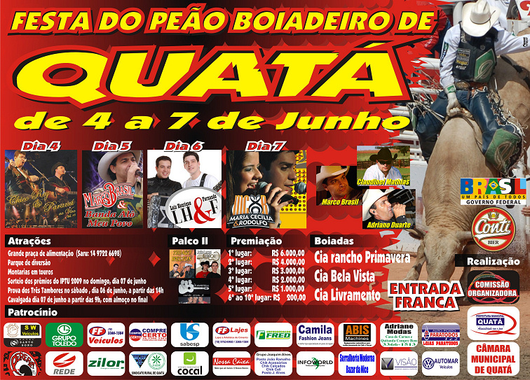 Milhares agitaram as quatro noites de evento realizado pela Prefeitura de Quatá pelo quarto ano consecutivo. Na primeira noite, além de grandes montarias em touro com os melhores profissionais do país e locutores como Claudiney Mathias e Adriano Duarte nas quatro noites, a dupla sertaneja Chico Rey e Paraná levou a galera a fortes emoções numa boa moda de viola.