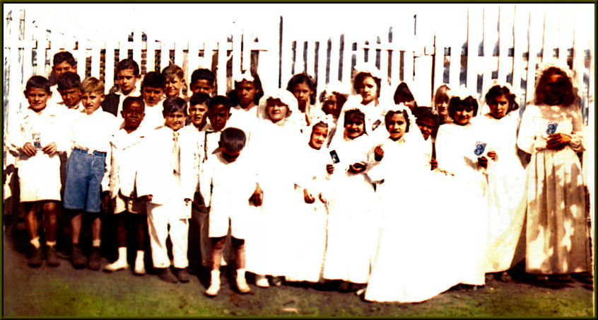 Esta foto foi tirada em 1950 na escola da Fazenda do Joaquim Marques, em seu aniversário. A professora da escola era a Dona Norma Carone, que nos preparou para a primeira comunhão. Depois da missa, tivemos uma mesa cheia de doces e guaraná. A festa foi animada pelo famoso compositor e sanfoneiro Mário Zan, e a portuguezada dançou o Vira Vira pra valer. Foi uma data inesquecível. Aí estão Capeloto, Francisquini, Ceolin, Pereira, Lodi, Marques e tantos outros.