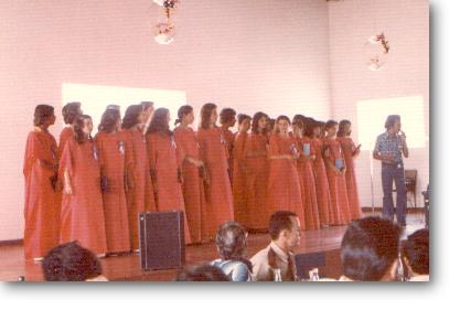 Foto provavelmente do ano de 1975, no Cine Palazzi, uma participação dos alunos que compunham o Coral