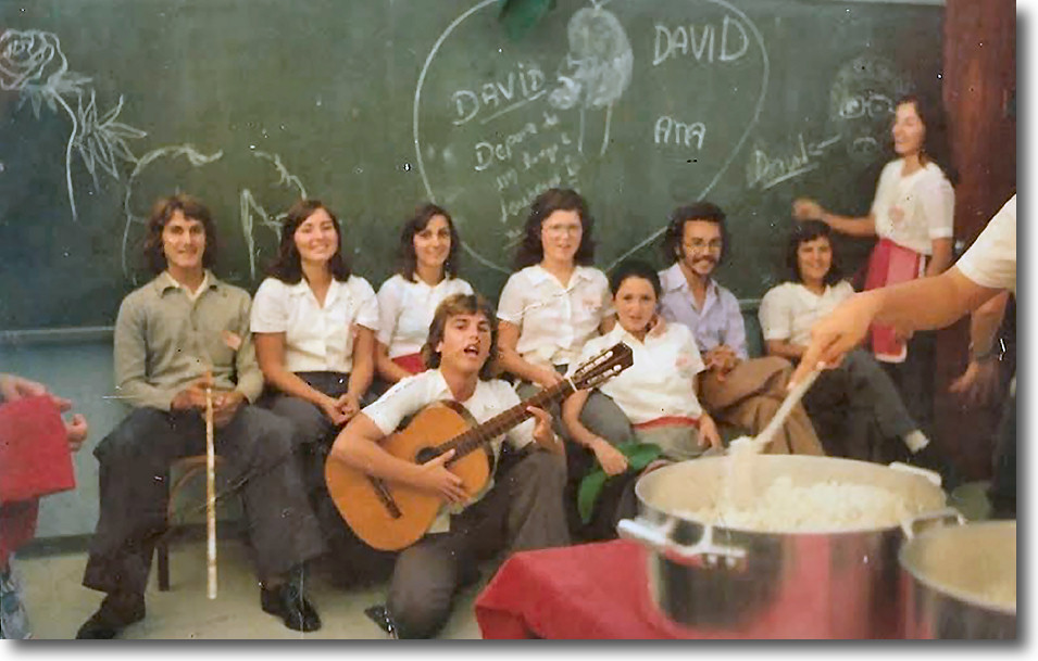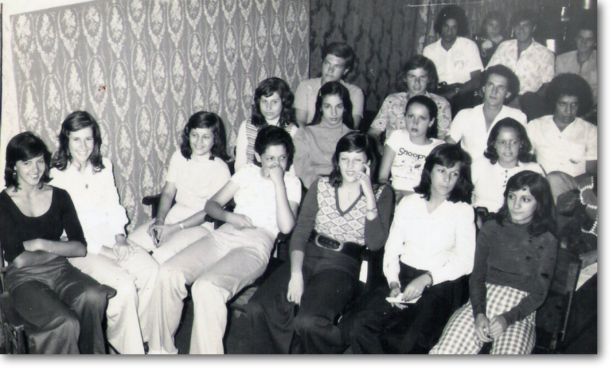 Da esquerda para direita na primeira fileira, com a pasta cinza entre os braços Marina Palazzi, ao seu lado Marta Pereira e Beth Pelini. Na fileira de trás, Heloísa Leite, Eliana Talon, Celi, ??? de óculos, talvez a Soninha. Na fileira de trás, ????, Carlos Eduardo Palazzi, Adonis, Oncinha (Mario Sérgio Pires Pinheiro), Gláucio, Eduardo Prevelatto - o Vermelho, Estevam Conde Neto. A senhora de branco à esquerda e atrás é a sra. Isabel Montini Barril. |