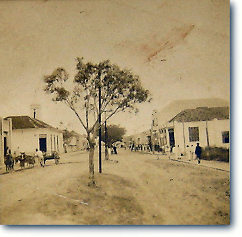 Ruas de chão batido, árvores ao centro e os charmosos postes de luz. Duas