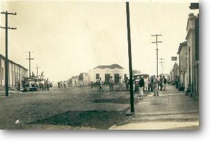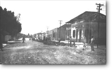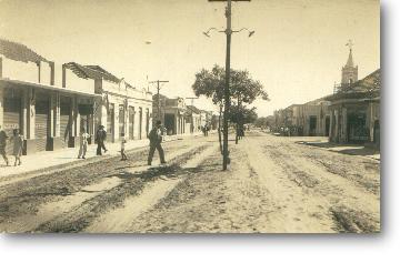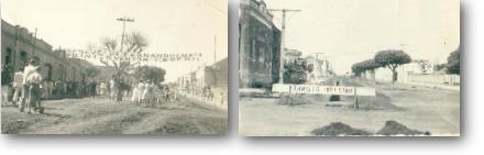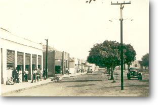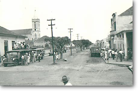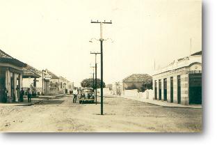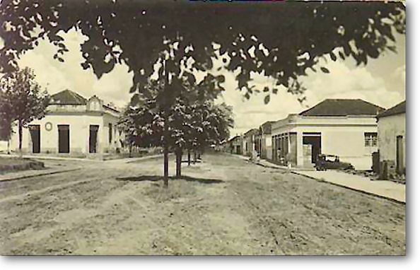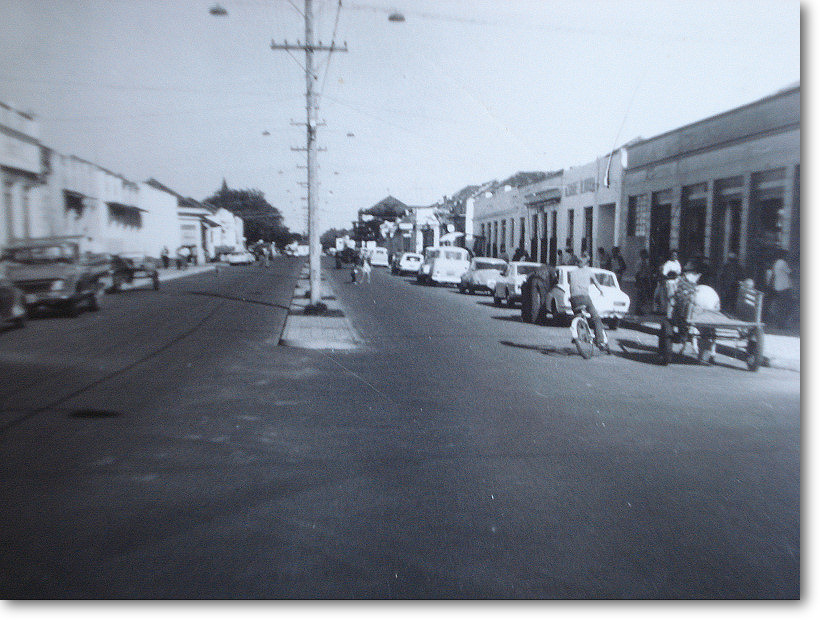 Em frente à Igreja Matriz , olhando em direção o que hoje é o Valejo. Rua de terra, a antiga Rui Barbosa. Na esquina um Fordinho e a rua completamente vazia.