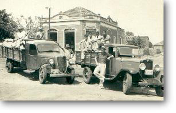 Em frente ao Hotel Patrão trabalhadores posam em seus caminhões que ajudavam a escoar a safra para a estação de Quatá.